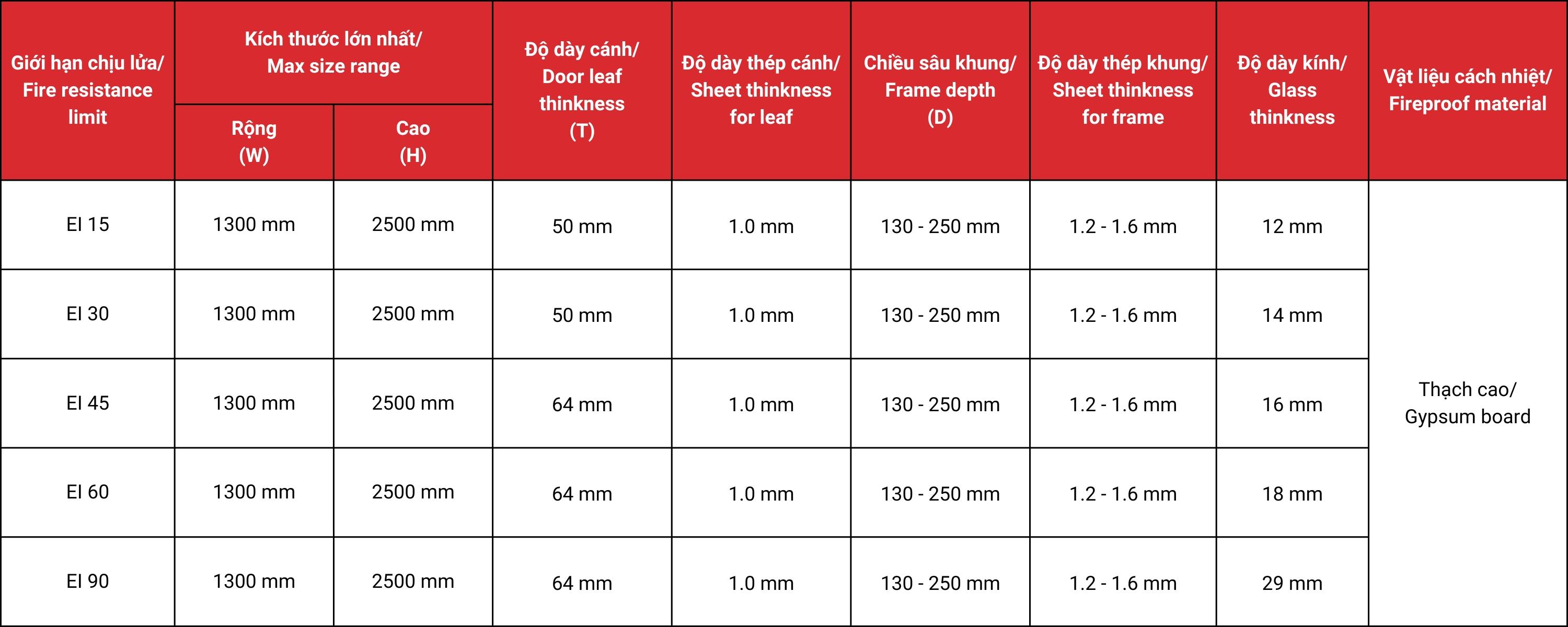 • Chịu được nhiệt độ lên đến 1200°C trong thời gian 15–90 phút (EI15–EI90)