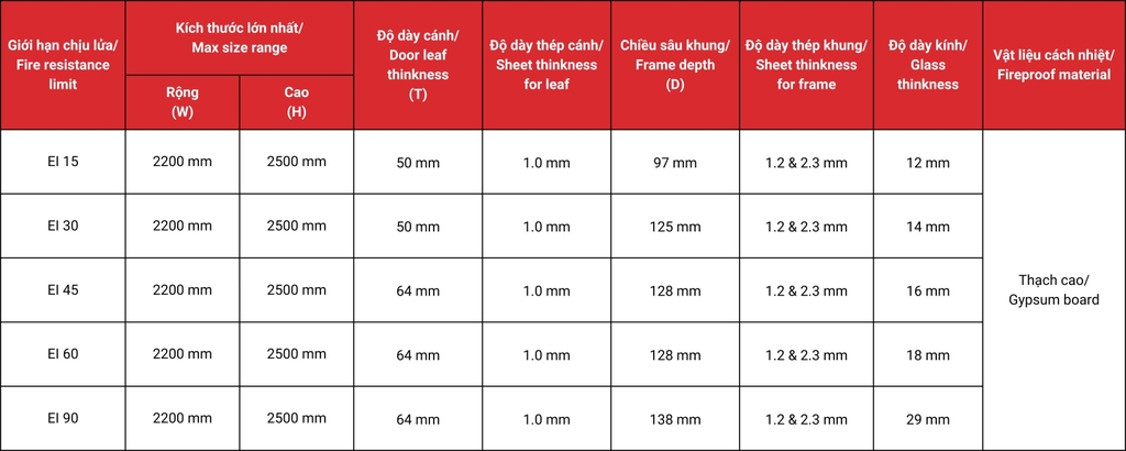 • Chịu được nhiệt độ lên đến 1200°C trong thời gian 15–90 phút (EI15–EI90)