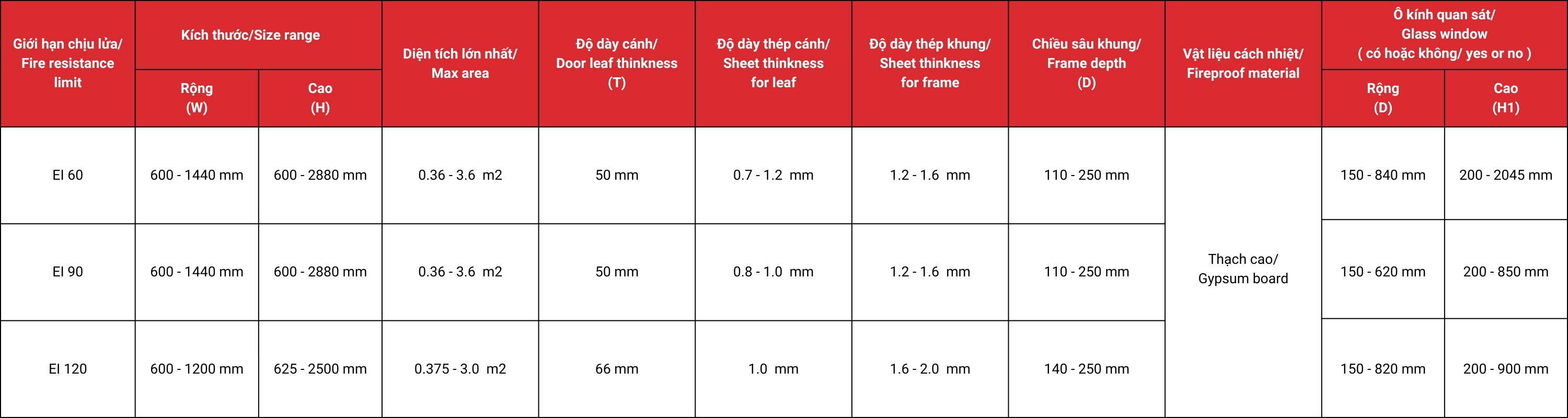 Đạt tiêu chuẩn EI30 – EI120, ngăn lửa và khói lan rộng trong thời gian 30 – 120 phút, giúp bảo vệ hiệu quả tính mạng và tài sản khi xảy ra cháy.