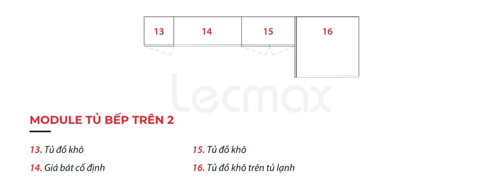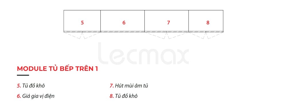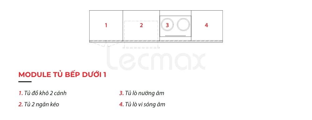 Tủ bếp được chia thành 4 cụm chính: tủ dưới 1 – tủ dưới 2 – tủ trên 1 – tủ trên 2, với các thiết bị bố trí khoa học: